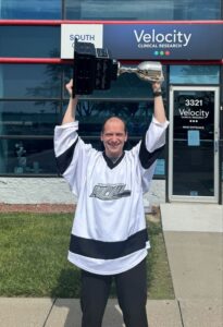So, it was hockey that led him to clinical research, but Dr. Raiser is quick to point out he’s hardly skating in stadiums… although his team did win their league championship. When they did, he marked the moment with a quick photo outside the clinic, trophy in hand — a small reminder of how the clinic and its community continue to shape his story.